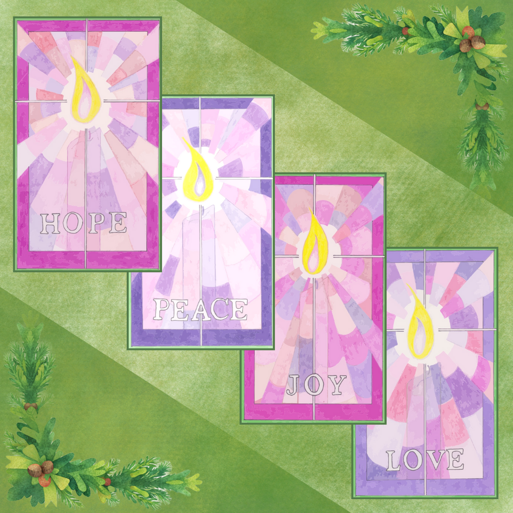 These beautiful banners hang out front of our sanctuary during the Advent season. The artwork for the banners was done by Dana Bassi, a member of the congregation. They remind us of the themes we focus on during the season and that we are called to be a light on the hill.